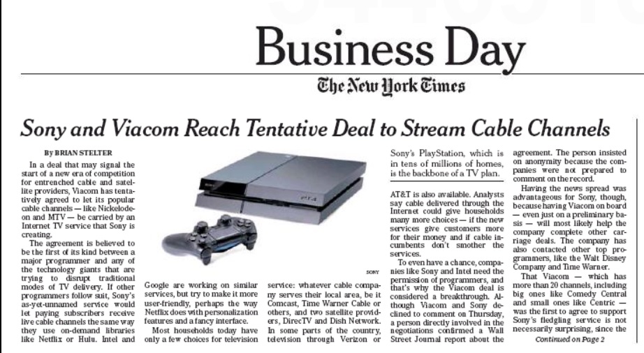 Another day, another change in the television business. Sony has convinced Viacom to go along with its plan to bypass cable and satellite companies entirely and offer live TV over the internet. Paid subscribers would be able to watch live cable channels the same way they use services like Netflix and Hulu. The New York Times says even though the deal has not been finalized, having news about it spread is good for Sony, since it may encourage other programmers to get on board.