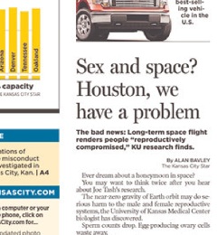 You might want to rethink a honeymoon to Mars says the Kansas City Star. Researchers at the University of Kansas say space travel does “serious harm to the male and female reproductive systems.” The scientists say they are frustrated that their findings come just as NASA’s shuttle program is winding down but say they have some ideas on possible therapies. Some studies have shown that exercise can help ease the muscle atrophy astronauts experience when they come back to Earth. Researchers say perhaps that theory could be…modified to address the reproductive systems.