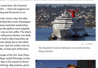 If you happen to know some who was on the stranded Carnival cruise ship, their slide show will probably include some photos of the following: eating cheese and beet sandwiches, drinking cold coffee, a darkened movie theater and toilets that worked only intermittently. The San Diego Union-Tribune got all the details of the ordeal when the ship was pulled safely into the city’s port yesterday. One passenger described in this way: “It was camping on the ocean, and I hate camping.”