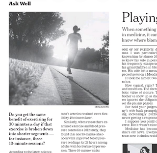 According to this morning’s New York Times, 10 minutes of exercise three times a day seems to have about the same effect as a continuous 30 minutes of exercise. Researchers say it still isn’t clear how abbreviated you can get—i.e. do six five-minute walks have the same effect as one 30-minute stroll?—but they say in general, short bursts paced throughout the day seem to be better for you and your blood pressure.