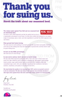 Yo no te quiero. Wow, I wonder they really feel. The executives of Taco Bell took out a full-page ad in several US papers this morning with the blazing headline, “Thank You for Suing Us.” The company has been embroiled in charges recently that the beef it uses is not really meat. An Alabama law firm in suing the fast food chain, claiming that the meat it uses is only 35 percent USDA grade beef. The rest, they say, is a combination of soy and oats. To set the record straight, Taco Bell published what it says are the true components in their special blend. In case, you’d like to recreate the recipe at home, here it is: