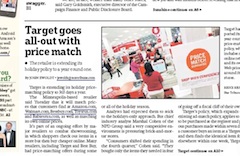 Target is preparing for an all-out price war. In an effort to combat “show-rooming,” the practice of checking out a product in store but purchasing for a cheaper price online, the retailer has said it will match prices from Amazon.com, Walmart.com, Bestbuy.com and a host of other online stores. The Minneapolis Star Tribune says the policy began as a holiday promotion but was extended to 365 days a year, a trend that analysts expect to spread around the industry.