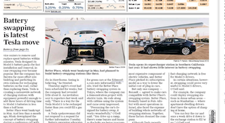 On Thursday, electric carmaker Tesla will demonstrate a fast way to swap out the batteries on its Model S sedan as an alternative to pulling over and re-charging at one of the stations Tesla has been building across the country. The San Francisco Chronicle says it’s an odd move, since the company has poured so much time and money into creating a network of charging stations. But founder Elon Musk says Tesla’s batteries were designed for a quick change, in case the swap out ever became the norm.