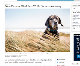 The New York Times has a good run-down of a new crop of pet tech objects on the market these days. At one end of the spectrum there’s Whistle, an accelerometer you clip to your dog’s collar, which registers its every move.  And then there’s something called the PASSport Pet Access Smart System, which, thanks to radio frequencies, allows “up to 20 animals to have unique time restrictions for going in and out of the house.” For overweight pets, there’s a whole host of treadmills to choose from, and even a feeding device that makes your cat work for its food.
