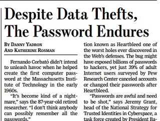 Why do we still use passwords? It’s a question the Wall Street Journal asks. Despite multiple major data thefts, passwords endure. The idea of using a computer password is actually 50 years old. Yet methods to replace the password, such as iris scanners and USB keys haven’t caught on.
