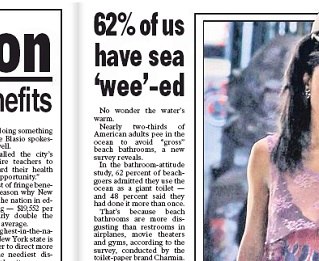 Next time you go for a dip at the beach, you may want to swim with your mouth closed. The New York Post says a new study claims 62% of Americans admit to peeing in the ocean to avoid using beach bathrooms. The survey by Charmin found people rate beach bathrooms as grosser than those on airplanes, in movie theaters and at the gym.