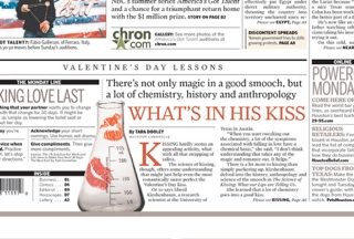 When you really think about what kissing entails, it’s kind of gross. But the Houston Chronicle says it’s a lot more than just swapping spit. There’s a whole science behind kissing, one that involves chemistry, history and anthropology. In honor of Valentine’s Day, the paper puts together some tips to help your technique, like making sure the person in your sights is someone you know: “Getting to know each other encourages hormones that foster a feeling of attachment. That means that some of those chemicals found when someone is experiencing a good kiss will already be in the system when you plant one on him or her.”