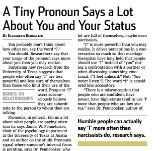 How often do you say “I?” The Wall Street Journal details a new study that finds people who say “I” a lot are less powerful and less confident than those who limit their use of the pronoun. They subconsciously believe they’re inferior to the person they’re talking to. That contradicts the common perception that those who say “I” a lot are full of themselves.
