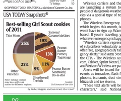 Mirror, mirror on the wall, what is the most popular Girl Scout cookie of them all? USA Today has a breakdown of cookie sales on its front page this morning. I would’ve thought “Thin Mints” were the runaway #1. They are #1—but only narrowly. According to the paper’s data, 25 percent of all cookies sold were Thin Mints. In second place are carmely Somoas with 19 percent and in third, with 13 percent of sales, peanut butter patties.