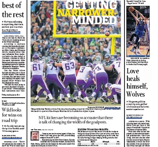 The Minneapolis Star-Tribune says with field goal accuracy rates at an all-time high, people around the NFL are wondering if it’s time to narrow the goalposts. Goalposts in the NFL have been 18 feet, 6 inches wide since the league was formed in 1920. Back in 1943, Ward Cuff led the league with a 33.3% accuracy rate. This year’s top two kickers have made over 90% of their field goal attempts.