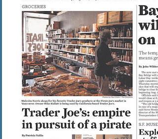 Trader Joe’s is pursuing a pirate, says the San Francisco Chronicle. Michael Hallatt has spent more than $350,000 in the last two years at the grocery chain. So what’s he doing with all that food? Reselling it across the border in Vancouver, Canada for a profit at his store, Pirate Joe’s. Despite the fact that the chain has no presence in Canada, Hallatt now finds himself in the midst of a major lawsuit, a circumstance that inspired him to remove the P from his store window—it now reads Irate Joe’s.