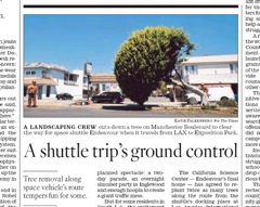 Residents of Los Angeles were excited to hear that space shuttle Endeavour’s final 12-mile journey would cut through their neighborhood before ending up at the California Science Center. The LA Times says they were less excited when they heard that 400 have to be cut down in order for the shuttle to squeeze down the city streets.