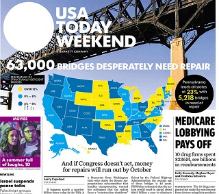 USA Today dedicates its front page to a new study that finds 63,000 bridges in the United States are structurally compromised. The report comes amid fears that the federal Highway Trust Fund, which provides funds for road and transit projects, is running out of money and could become insolvent by the fall unless Congress acts. The fund is paid for by the federal gas tax, which hasn’t been raised since 1993.