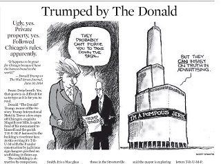 In a city known for its architecture, Donald Trump’s 96-story Trump International Hotel along the Chicago River is not winning over many people - mostly because of the giant, “TRUMP” sign being put on it. The Chicago Tribune says the sign, while ugly, does follow Chicago’s rules and will likely stay. In an editorial, the paper says the scaffolding being used to erect the sign is attractive by comparison. The paper says it’s a shame because the building really is beautiful, but its sign strips away the building’s elegance.