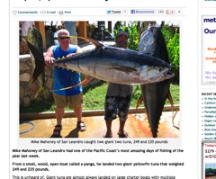 A Bay Area man managed the “one of the Pacific Coast’s most amazing days of fishing of the year last week” and he did it all from inside a tiny wooden boat called a panga.  The San Francisco Chronicle says Mike Mahoney managed to catch an enormous bluefin tuna, weighing in at 249 after throwing in a line baiting with sardines. About an hour later, he landed another one—a 235-pounder. Mahoney says it was a feat that took several hours and left his back and arms sore. But it was worth it: “Good thing I love to eat tuna,” he said.