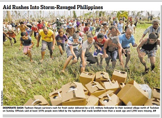 There’s a heartbreaking photo on the cover of the Wall Street Journal. Survivors of Typhoon Haiyan in the Philippines are rushing for fresh water delivered by a U.S. military helicopter. The official death toll from the storm stands at nearly 4,000. Nearly 1600 remain missing.