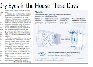 Doctors say they are treating a growing number of people for dry eyes. The culprits? Smartphones and air-conditioned office buildings. Postmenopausal women and the elderly are the usual suspects for dry-eye syndrome but in recent years the condition has spread across the population, says the Wall Street Journal. Experts believe the problem has reached the heights it has because people aren’t blinking enough, a simple action that lubricates the eye.