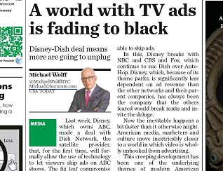 USA Today’s Michael Wolff says the deal between Disney and Dish that allows viewers to skip ads on ABC shows is a big step in ending advertising as we know it. Media companies have started adapting to a world without ads. But brands so far have been unable to find a medium which works better than television for advertising their products.