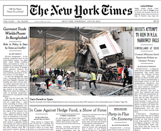A high-speed train was going more than twice the speed limit when it derailed and crashed in Spain yesterday, reports the New York Times this morning. There were about 200 people on board and authorities say at least 60 are dead. The driver reportedly told supervisors he was travelling 180 km/hour (about 110 MPH) in a zone with an 80 km/hour speed limit. The impact was so forceful that one of the train’s car shot up 15 feet in the air.