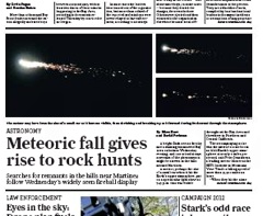 Some beautiful photos on the front page of the San Francisco Chronicle this morning after a meteor streaked across the Bay Area sky on Wednesday night. The car-sized meteor put on a “spectacular light show” as it entered the Earth’s atmosphere around 7:45 p.m.; onlookers described a “giant fireball” lighting up the sky. Astronomers say the hunt is now on for debris from the meteor. VIDEO