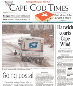 Why did the turkey cross the road? To attack the mail carrier, of course. A certain wild turkey went “postal” yesterday says the Cape Cod Times. A substitute mail man says he was more than a little nervous when, as he worked his route, a male turkey “came up alongside the vehicle’s starboard and launched into a series of side jumps.” That was after an initial encounter with the bird which caused the carrier to gun it down a side street. Apparently, the turkey knew a shortcut. After their tussle ended the postal worker said he had an idea of what might have rustled the turkey’s feathers: “I think it might be the eagle painted on the side of the truck.”