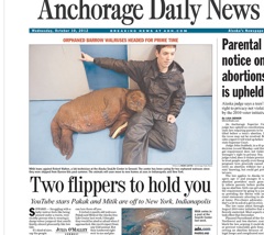 Anchorage Daily News columnist Julia O’Malley got to spend time with some YouTube stars yesterday. Pakak and Mitik are baby walruses rescued from the North Slope earlier this month. The pair has found fans all over the world after VIDEOS of them went viral. O’Malley, who calls them “obsessive spooners,” describes snuggling with a walrus like this: “[It] feels like being pinned under a warm, very chubby person who is wearing a damp velour jumpsuit that smells faintly, almost pleasantly, like low tide.” The pair is leaving Alaska this week—Patak is headed for Indianapolis and Mitik is coming to the New York Aquarium. Check them out below: