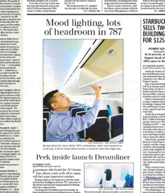 After teasing us for years, Boeing finally unveiled the interior of its first 787 Dreamliner yesterday and the Seattle Times aerospace reporter was on the scene to check it out. Before you get your hopes up, I’ll just come out and tell you: leg room is about the same. But thanks to innovations like stow bins that swivel upward, toilets that double as bidets and windows that darken with the touch of a button, there’s a lot to be excited about. VIDEO TOUR