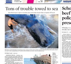 The mayor of a town in Florida has said no to government scientists who want to necropsy the carcass of a 30-foot sperm whale that recently washed up on the town’s most popular beach. The Sun Sentinel says he feared that the process—which can cause the whale to explode—would be “bad for tourism.” (“No way are we going to let them cut this mammoth animal open on our beach. The stench would be incredible. Cut him open, and then cut the head off? I don’t think so.”) Instead, the 30-ton mammal was dragged out to sea. See the rescue effort below: