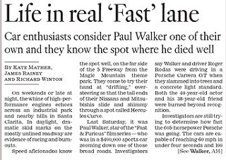 Paul Walker wasn’t just playing a character who liked to drive fast. The LA Times says sports car enthusiasts considered the Fast & Furious star to be one of their own - and the spot where he died was well known for hosting exactly the type of races featured in the films. The 605-horsepower Porsche he was in when he died is capable of reaching 60 mph in under four seconds and 100 mph in under seven.
