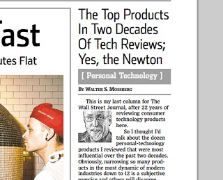 Walt Mossberg uses final tech column at the Wall Street Journal to talk about the 12 most influential tech products he’s reviewed in his 22 years at the paper. Among the products he says changed the course of digital history are the Newton Message Pad, Netscape Navigator, Google, the iPod, the iPhone, Facebook and Twitter. Mossberg says Apple introduced more groundbreaking products than any other company over the past two decades.