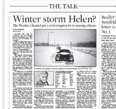 If the Weather Channel has its way, Helen could become one of the most despised names in the country. The Chicago Tribune says the channel wants to name winter storms the same way meteorologists name tropical storms. The idea has gotten a cool reception in the weather community but apparently it’s still a go. That means you might start to hate the names “Athena,” “Brutus,” “Caesar,” and “Helen” when the snow starts piling up. Below, the full list of proposed winter storm names.