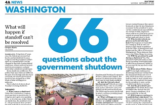 With a government shutdown looming tomorrow, many people have questions about what services will be affected. USA Today answers 66 questions about the shutdown, ranging from will I still be able to get a passport (maybe, but hurry) to will the government continue to collect taxes (of course). Most government workers would be furloughed starting tomorrow. And the shutdown will likely cost the government money, rather than save it.