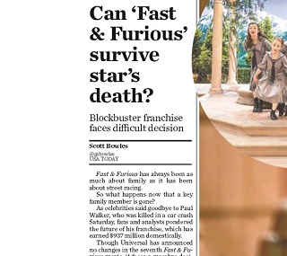 USA Today speculates about the future of the Fast & Furious film franchise in the wake of Paul Walker’s death in a car crash. Universal Pictures had planned to release the 7th installment in the series in July. USA Today says whether the film franchise continues all depends on how co-star Vin Diesel handles Walker’s death.