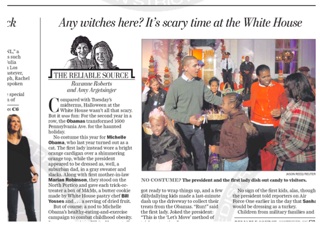 Considering the First Lady’s healthy eating mantra, I was wondering if the Obamas would be passing out treats for Halloween. According to the Washington Post, trick or treaters got a box of M&Ms, a butter cookie and a serving of dried fruit. Michelle appeared without a costume, wearing a bright orange sweater set while the president went as “a suburban dad” in a gray sweater and slacks. The kids were absent but the president told reporters that Sasha had dressed up as a turkey earlier in the day.