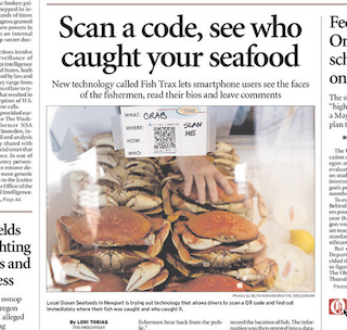 Some cool technology for foodies on display in the Oregonian this morning. It’s easier than ever to find out where your fish are from, thanks to a new service called Fish Trax Marketplace. All you do is scan the QR code at the grocery store’s fish display and in an instant you’ll have the fish boat captain’s name, the ship’s name and even the middleman’s info at your fingertips. The idea was inspired by a similar system used by federal officials to track fish sales.