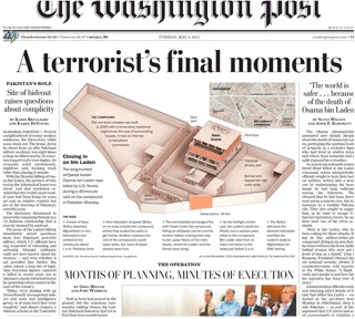 The Post does some nice work on behalf of its adult audience too, including this image, which I’ve seen in several papers, of the president and his staff watching the raid go down. The headline, and accompanying story reference the “months of planning, minutes of execution.”