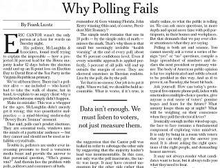 Pollster Frank Luntz pens an Op-Ed in the New York Times explaining why no one predicted Rep. Eric Cantor’s stunning loss in the Republican primary. Cantor’s pollster predicted a 34-point lead 12 days before the election, yet Cantor lost by 11 points. Luntz says polls are only one part of the equation. Qualitative analysis, such as talking to voters to gauge their mood is just as important.