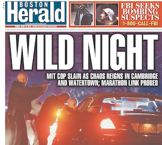The news out of Boston this morning is changing very quickly, and much of what’s happened did so after the papers went to press. The Boston Herald has the most updated coverage on its front page, showing an image from the shootout between police and the two young suspects. The suburbs are still on lockdown after wild night in which an MIT police officer was killed and a transit officer was wounded. The Herald is reporting that one suspect has been killed and the other is still at large and considered armed and very dangerous.