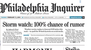 The Philadelphia Inquirer says the National Weather Service on Monday did something highly unusual: It predicted a snow total for a storm three days away. The agency says it wanted to counteract wild rumors swirling on social media of a 30-inch storm. Meteorologists say some weather-related Facebook pages use suspect computer models to drum up foreboding forecasts that nearly always prove to be wrong, but not before they’ve caused panic.