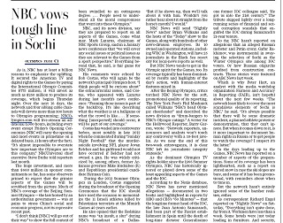 In the Washington Post, Paul Farhi wonders if NBC will objectively cover what he calls “the most troubled Olympic games in a long history of troubled Olympic games.” Construction issues, security fears and an open hostility to gay people are all among the issues plaguing these games. With the Olympics typically being feel-good events, Farhi says it will be a challenge for NBC to balance its coverage.