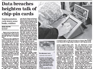The recent massive credit card data breaches have led to a renewed fight over how quickly to implement chip cards in the United States, and who should cover the cost. USA Today says banks are balking at the cost of moving to European-style cards with microchips that generate a one-time security code for each transaction. Visa and MasterCard say retailers who haven’t converted to a chip system by 2015 would be responsible for fraud charges if their systems are hacked.