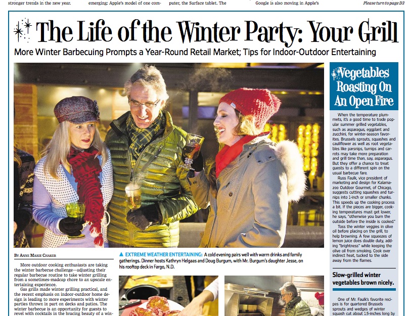 Who says you have to put your grill away when the temperature drops? The Wall Street Journal says cold-weather barbecuing has taken off in recent years, creating a year-round market for grilling accessories. The appeal of an indoor/outdoor dinner party seems obvious to enthusiasts: “It’s a lot more pleasant to stand next to a grill when it’s chilly than when it’s 100 degrees.”