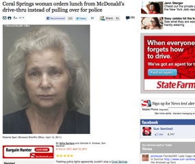 When a cop in Florida noticed a woman driving with a faulty brake light, he turned on his siren to pull her over. Not only did she ignore him, says the Sun Sentinel, she went through the drive-thru at McDonalds, ordered lunch and then continued on her way. Several other cop cars joined the pursuit, at one pointing boxing the woman’s car in. She managed to reverse out of the box and continue on her way. Finally, police smashed her window and arrested her. They say the woman had no record, was not under the influence of drugs or alcohol and had no reason not to stop. Maybe she just really wanted to eat her lunch.