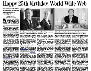 The Philadelphia Inquirer’s John Timpane marks the 25th birthday of the World Wide Web’s invention. He says the web is the most ambiguous invention in human history. He calls the web and the Internet on which it works, Shiva, the god of creation and the god of destruction. While it has made our lives infinitely easier, it has also destroyed or threatens to destroy countless businesses and industries.