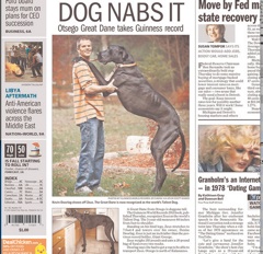 The Detroit Free-Press puts a local hero on the front page this morning. That’s Zeus the Great Dane. He was just crowned the world’s largest dog by the folks at the Guinness Book of World Records. Measuring 44 inches from foot to shoulder, Zeus is about 7 foot 4 when he stretches out, like in this photo. His owner says Zeus goes through a 30-pound bag of dog food every two weeks.